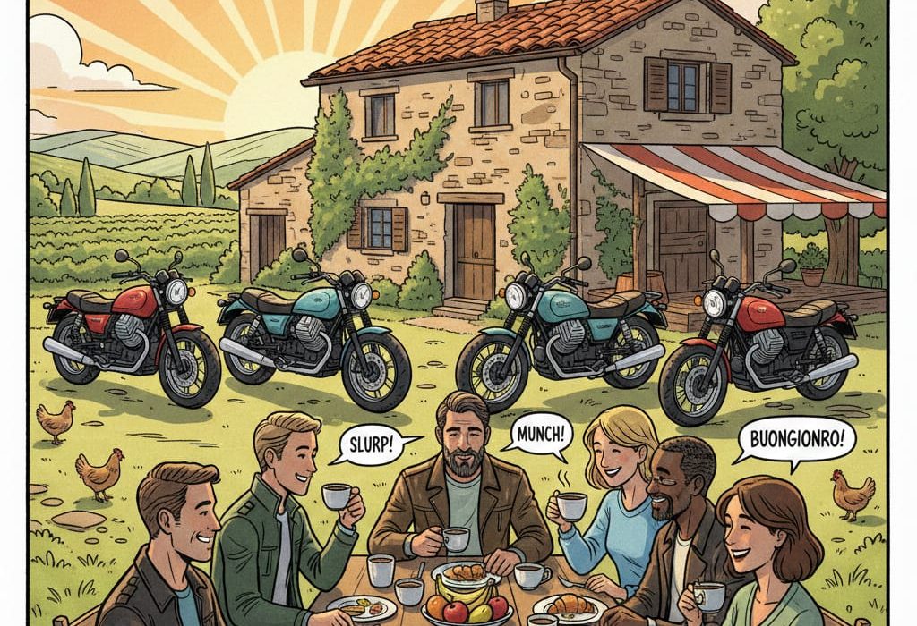 Wir fachsimpeln über Drehmoment, italienische Elektrik (ein Mysterium für sich) und die besten Kurven im Revier. Es gibt kein “zu alt” oder “zu jung”, nur “zu wenig Hubraum” – und selbst darüber lässt sich bei einem Brötchen streiten.