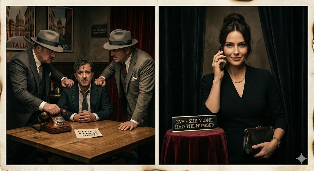 Die Rettung: Aber wir haben Eva. Sie ist die “Consigliere”, die niemals vergisst. Während alle anderen den Kopf verloren, hatte sie die Nummer des Finders noch in ihrem schwarzen Buch.